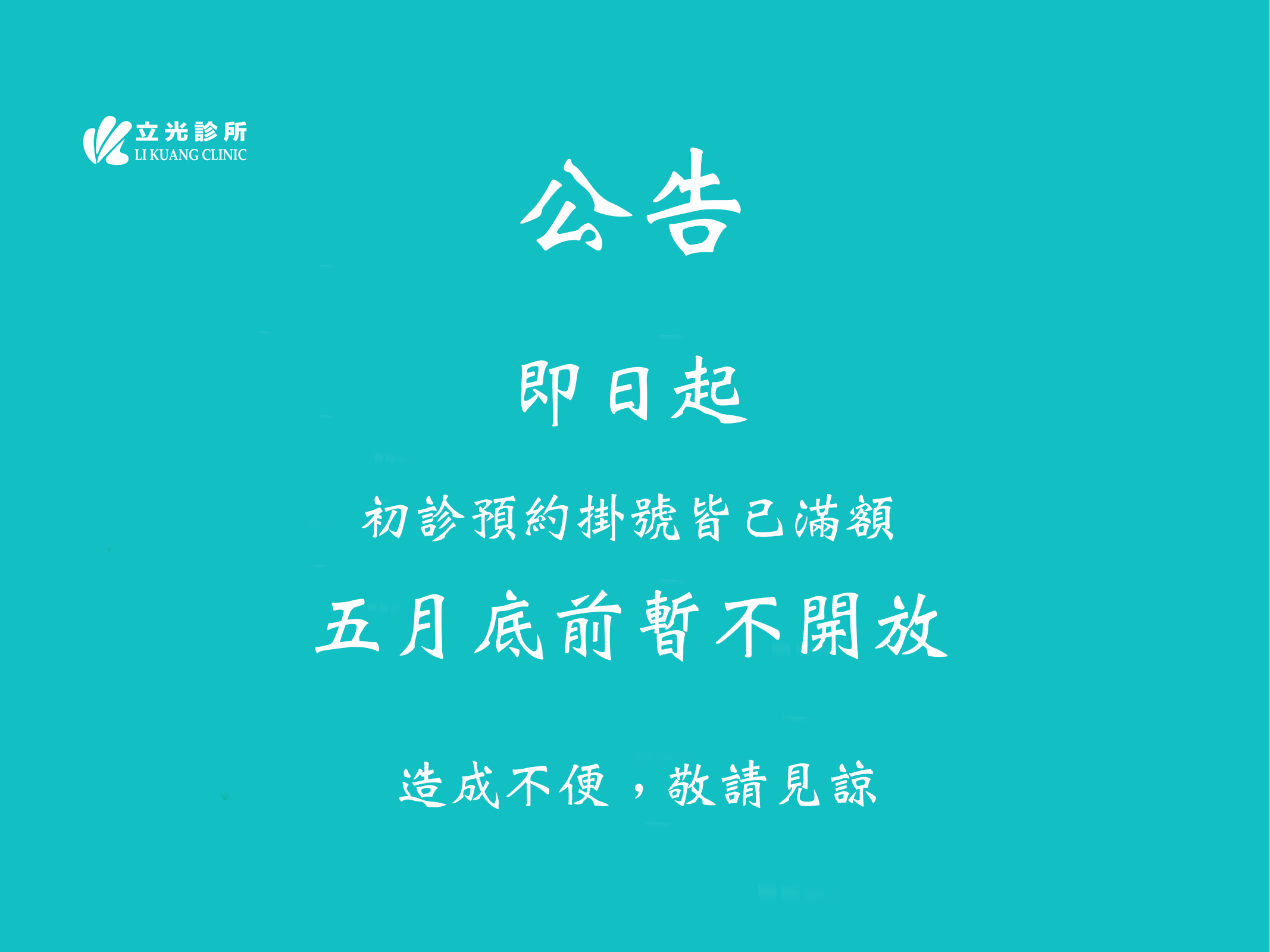 公告: 即日起, 初診預約掛號皆已額滿,五月底前暫不開放