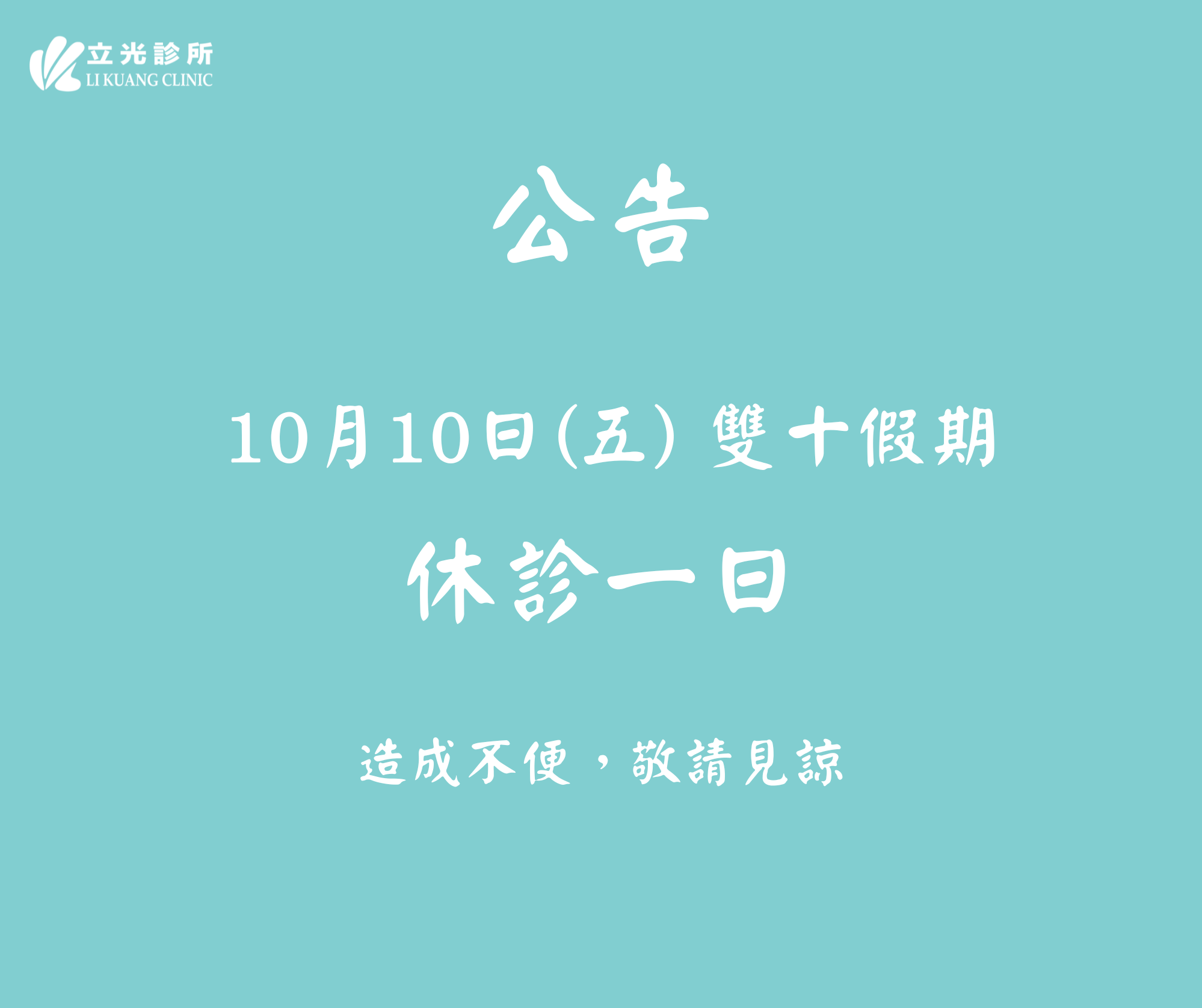 公告|診所於 10/10 (五) 雙十假期 休診一日