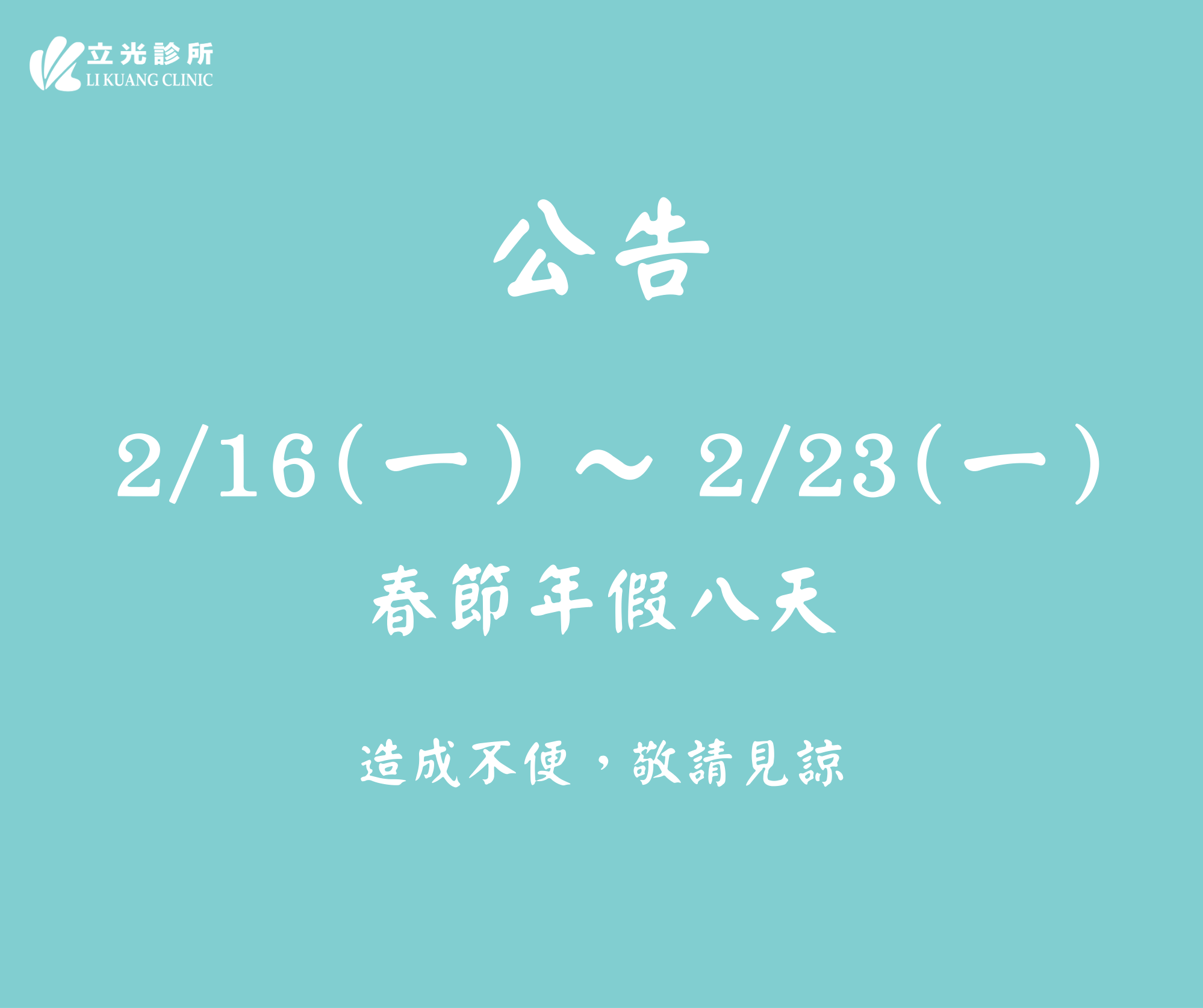 公告|2/16 (一) ~ 2/23 (一) 春節年假 8 日