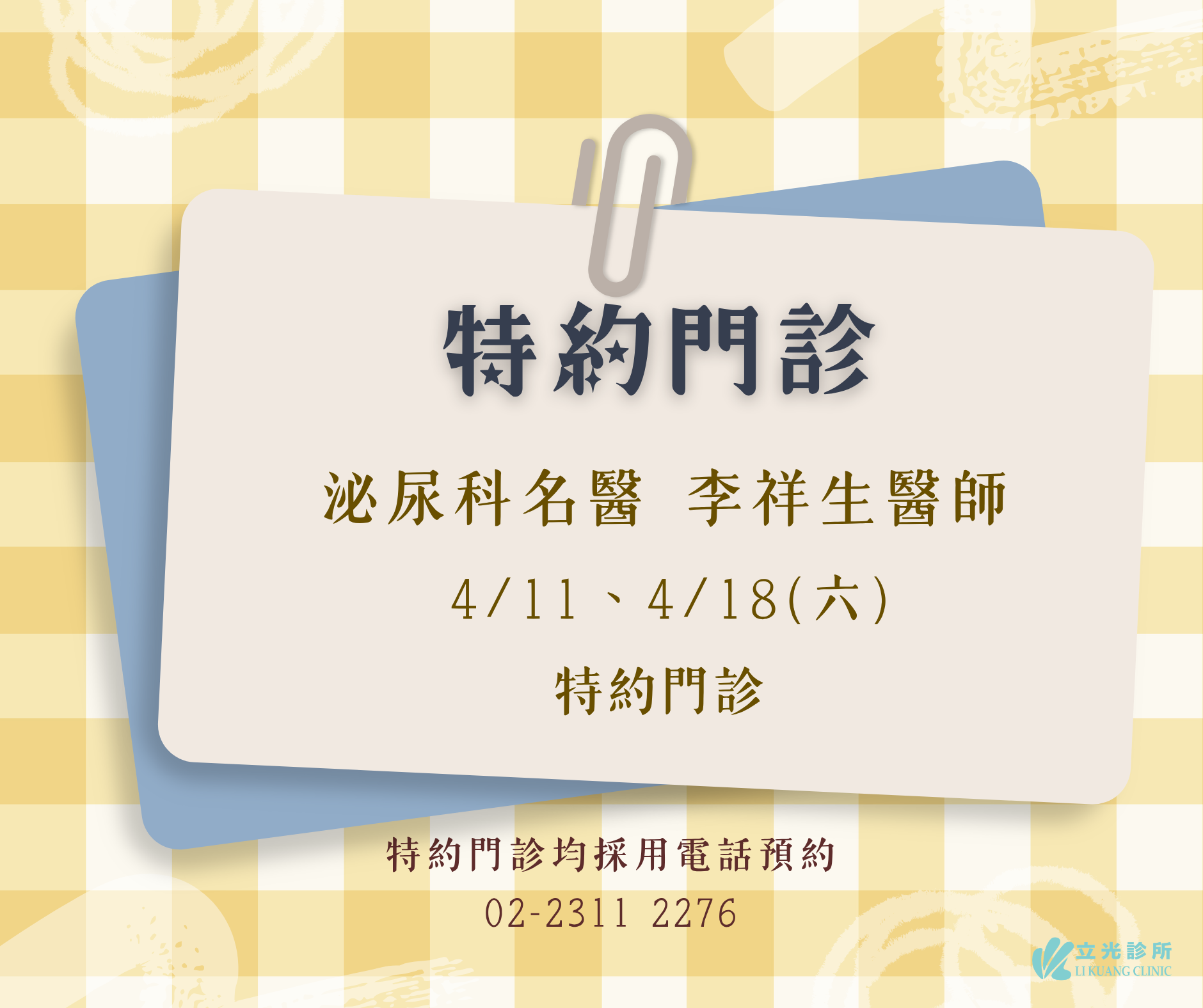 /泌尿科名醫 李祥生醫師 4/11、4/18 (六) 特約門診。